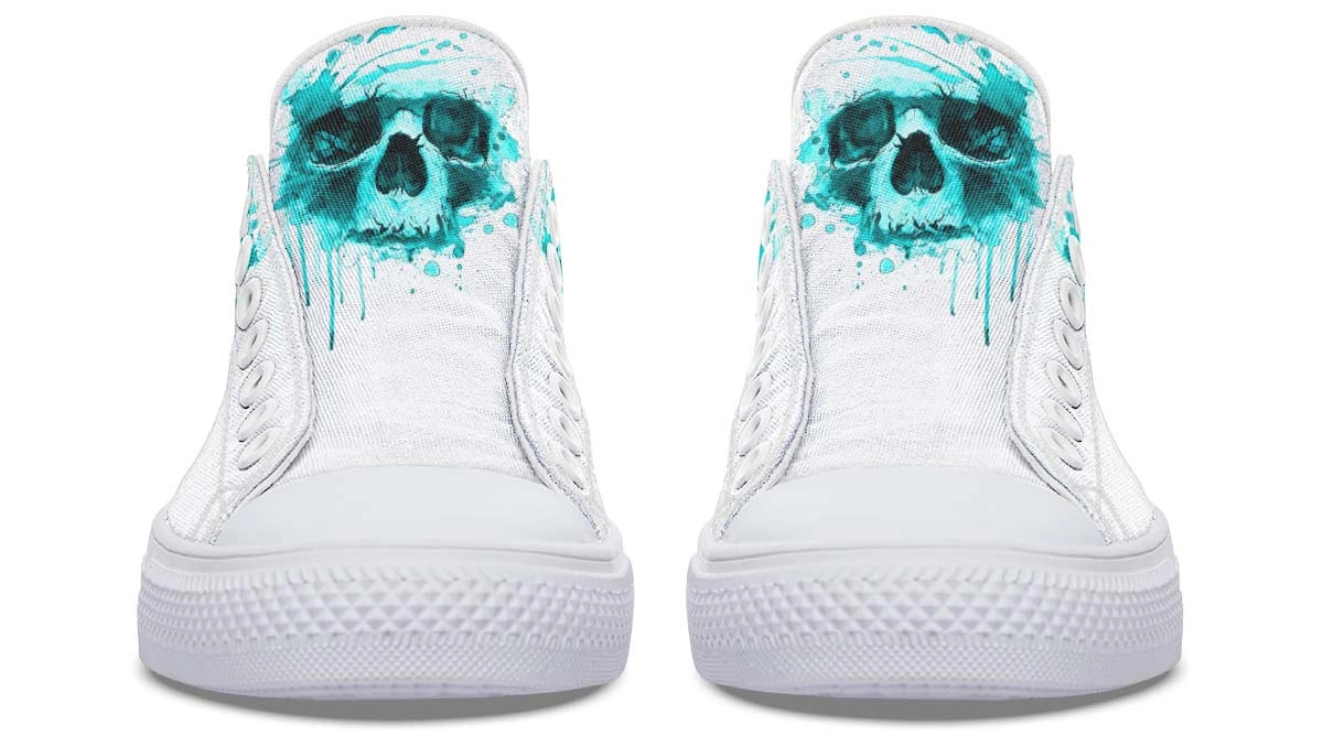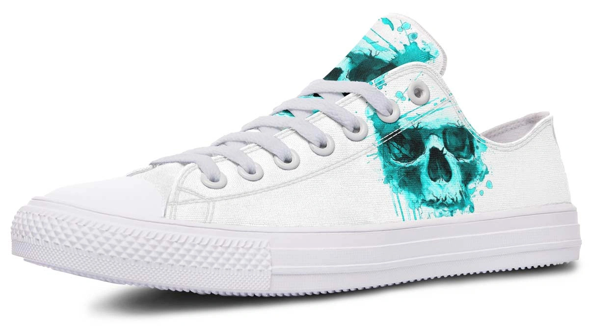 Stand out with Cyan Skull Print White Low-Top Sneakers. Features a striking blue skull design on crisp white canvas. Perfect for bold, casual fashion fans.